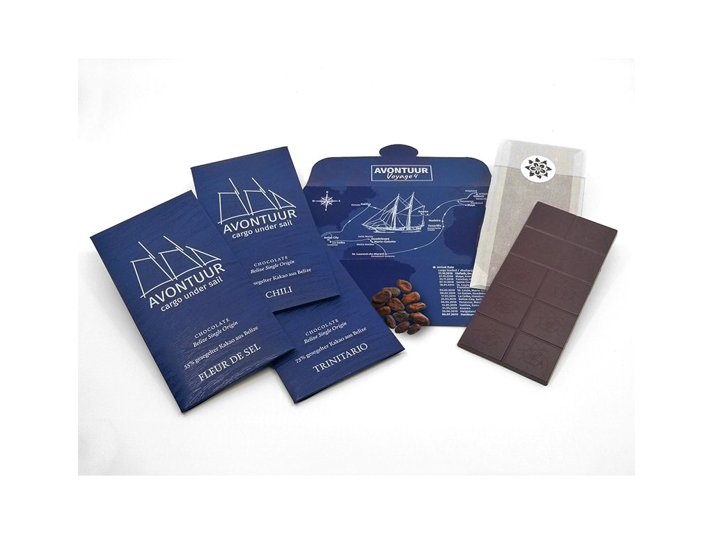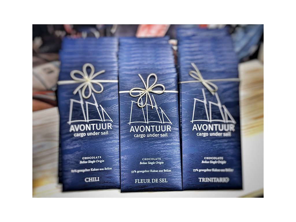 Čokoláda Avontuur TRINITARIO (Trinitario je poddruh kakaovníku): tato tmavá čokoláda je mletá na kameni a vyrobená z pouhých dvou ingrediencí. Obsahuje rafinované kousky kakaových bobů a kombinuje křupavý zážitek s krémově čokoládovou chutí. Výrobce Choco Del Sol věnuje zvláštní pozornost původu surovin a získává kakao výhradně a přímo od družstev v Belize, které zaručují ekologické zemědělství, za které továrna na čokoládu ráda platí spravedlivé ceny.